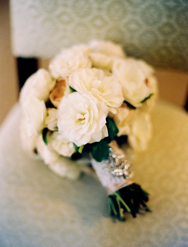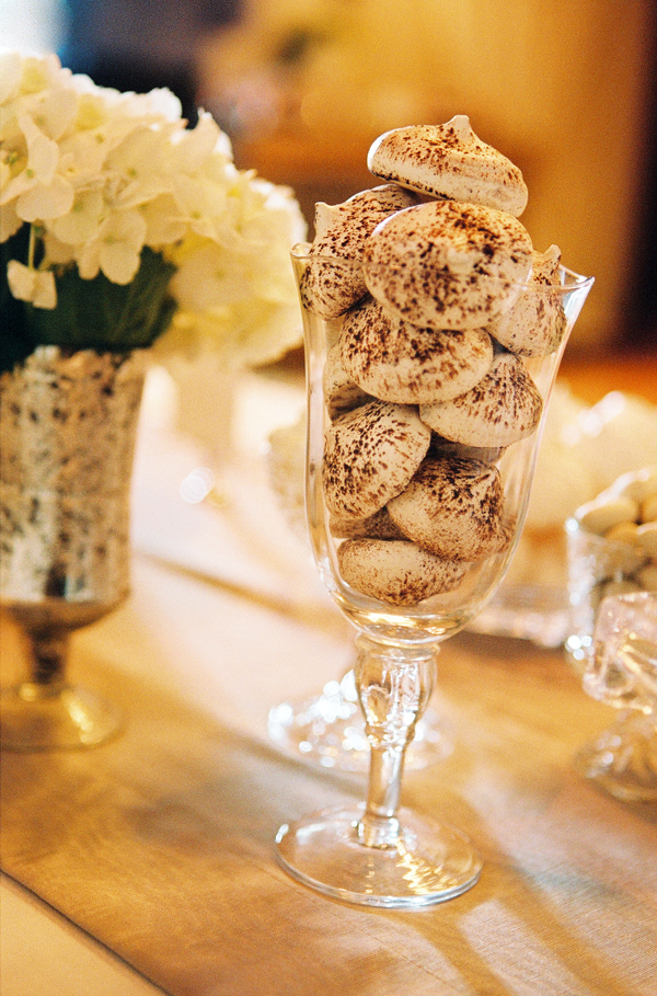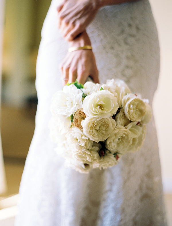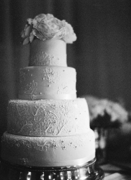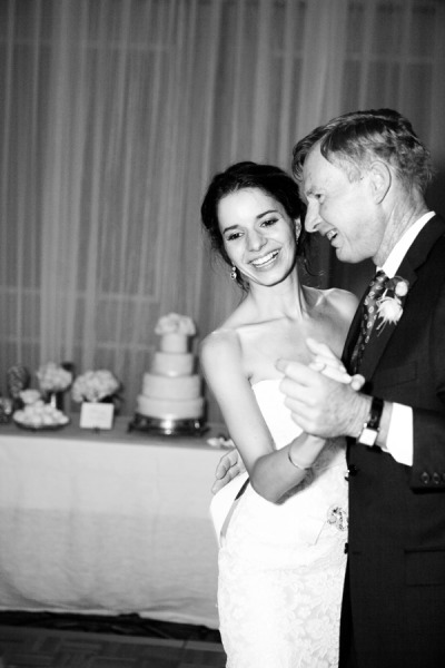 After a joyous ceremony, guests made their way to the Biltmore Hotel for California cuisine and more gorgeous blooms from Flower Wild. Arrangements of ruffled roses, café au lait dahlias, Queen Anne's lace, ranunculus and dusty miller graced each table, along with votives full of flickering candlelight. The bride's mother embroidered each guest's name on a hem-stitched linen napkin, which served as escort cards, and she stitched together the couple's fabric "guest book" into a beautiful quilt. Homemade cookies and local wildflower honey were sweet treats for guests, but not sweeter than the father-daughter dance; after major surgery, he set aside his pain to twirl his beautiful daughter on the dance floor. Following heartfelt toasts at the open mic, guests enjoyed a Robyn Loves Cake confection modeled after the bride's gorgeous gown, captured sublimely by Susan Dean Photography and first spotted on Style Me Pretty.