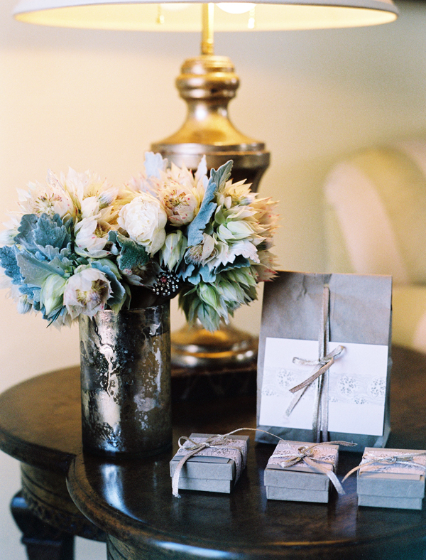 After selecting the stunning Mural Room of the Santa Barbara Courthouse for their ceremony, the pair decided that the Old World Spanish style of the Four Seasons Biltmore Hotel was the perfect compliment to the bride's love of heirloom flowers and soft, subtle shades. Announcing the wedding's elegant atmosphere, Corinne worked with calligrapher Renée Troy to create a custom letterpress suite with linings inspired by decorative Spanish tiles and tapestries.