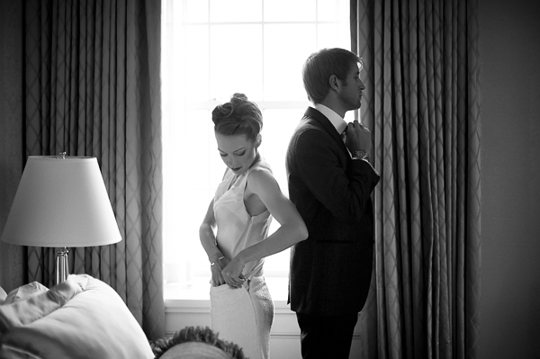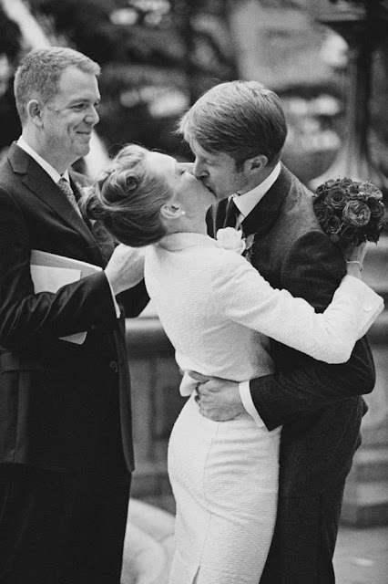 I knew this wedding was a winner when John, looking over my shoulder, said "That's gorgeous." And boy is it ever. Mel and Geoff meet as NYU undergrads and tied the knot in the Big Apple with their photographers, Justin & Mary Marantz, also serving as witnesses. The pair dressed at The Pierre Hotel (it was the image of him zipping up her vintage Armani
