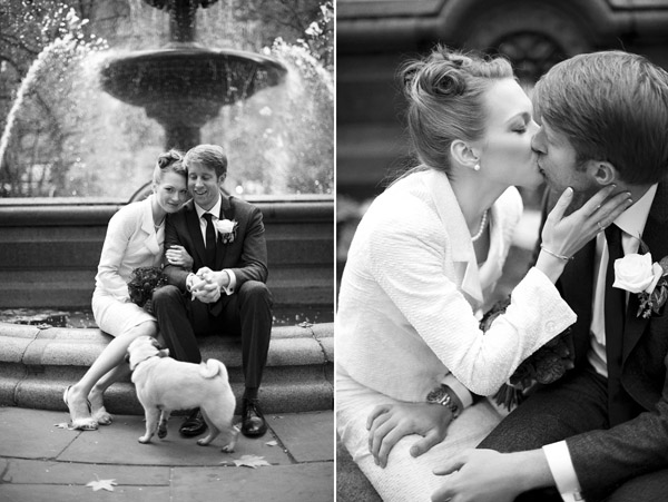 skirt that floored John), then brought along their adorable pug for an outdoor ceremony at City Hall Park. After exchanging rings, the newlyweds indulged in a celebratory dinner at Bubby's and found themselves embracing in the autumn rain.