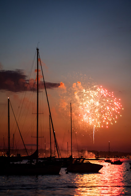 paired with gold-banded china and white and blush arrangements by Sayles Livingston, and after a slice of cake from Confectionery Designs, guests were treated to a fireworks display over Narragansett Bay. The bride slipped into a lace Valentino dress for the sparkler send-off, and the newlyweds, who met on the Georgetown sailing team, headed to their after-party in a darling Hinckley picnic boat.