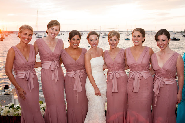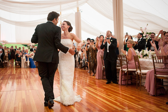 Vogue's Senior Accessories Editor, Rickie, is also the daughter of Tom Ford International chairman, so there was no question about who'd design her gown. The strapless organza and lace dress was perfectly accessorized (naturally) with diamond drop earrings, a Cathedral veil, white satin peep toes and a gorgeous white bouquet by Sayles Livingston. The bride wanted blue for her six bridesmaids, but Mr. Ford suggested pink might be more appropriate for summer; they agreed on "blush" when Rickie wrinkled her nose at pink! Derek and his groomsmen looked handsome in black tie, and white rose boutonnieres distinguished them from the rest of the well-dressed guests.