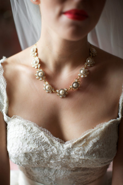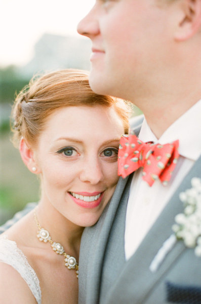 Mary wore the lace gown both her mother and grandmother had worn, beautifully restored by Ann Hamilton. Gold Milk & Honey sandals paired with a pearl and crystal necklace, pearl studs and a tulle veil. Her bridesmaids looked darling in navy LulaKate dresses with coral sashes, and their baby's breath posies by La Bella Rose matched the bride's pink garden and spray rose bouquet. Harold wore a made-to-measure three-piece suit, and he and his groomsmen looked dapper in Southern Proper bowties.