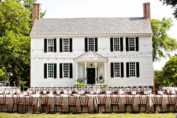 Thomas Jefferson's boyhood home makes for a beautiful wedding venue-especially if the historic house belongs to the groom's family, whose parents still live and operate Tuckahoe Plantation. This Southern couple wanted their big day to feel like a dinner party; the design team at Karson Butler Events suggested they bring long tables and classic Bentwood chairs onto the home's front lawn for an alfresco reception.