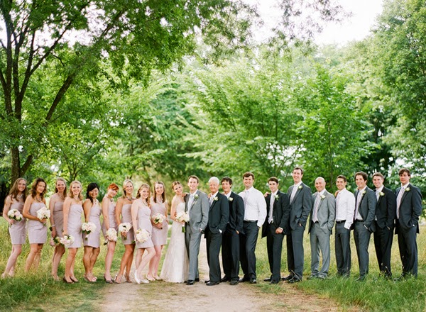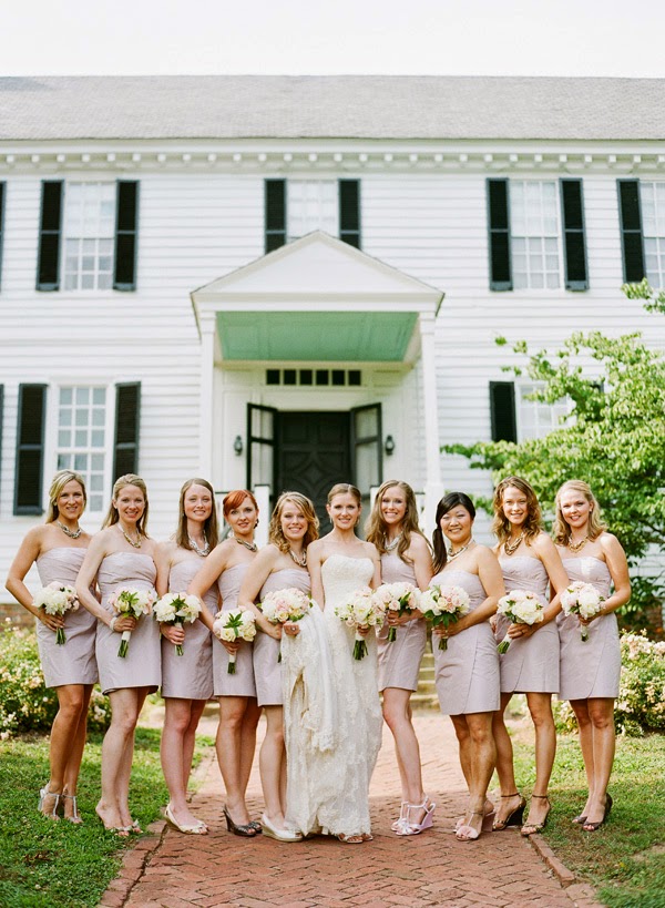Heather wore a lace appliqué gown and Badgley Mischka embellished sandals; while her maids looked pretty in matching J.Crew silk taffeta dresses, Addison and his pals wore mismatched dark suits. The pair was married in an outdoor ceremony beneath some of the property's enormous oak trees. The bride's father officiated their intimate "I do's" under an arch covered in petal pink roses, grown and arranged by the groom's mother, a master gardener.