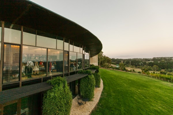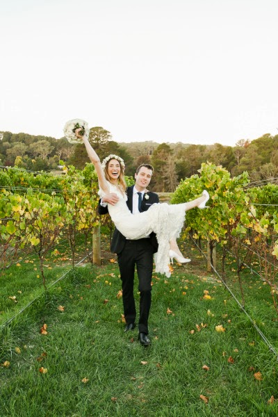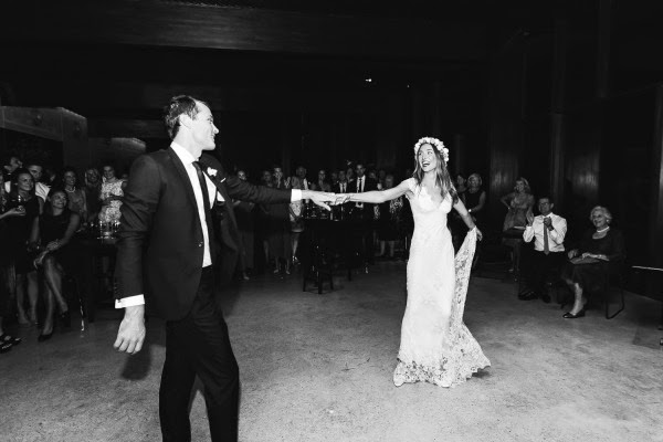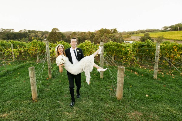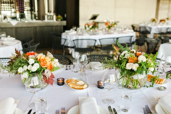 After exchanging wedding vows overlooking Port Philip Estate, the couple posed for photos in the vineyard. Dinner was served in the Estate's modern dining room, with white rose and fall foliage arrangements serving as a romantic foil to the concrete walls and structural furniture. Dinner and toasts followed, and after one last spin on the dance floor, Poppy and Hugh headed off on their honeymoon and into their life as husband and wife.