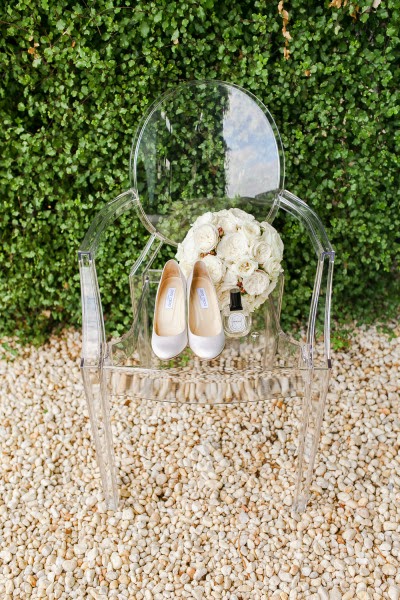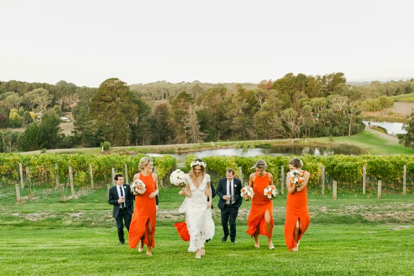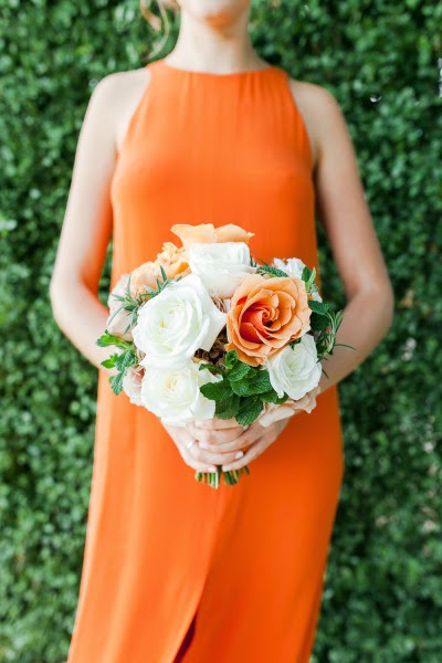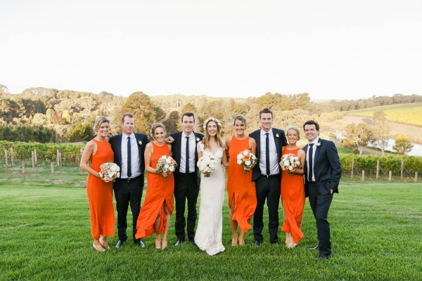 The bride wore a lace sheath flecked with delicate crystals by Temperley London; a pair of white Jimmy Choo pumps, a lush bouquet of white garden roses and a crown of white and mauve blooms by florist Tori Allen completed her elegant boho bridal look. Bridesmaids wore bold orange dresses by Willow and matching nude pumps from Nine West; their round bouquets were filled with white, mauve and bright orange roses with sprigs of rosemary and mint. Saville row tailor Spencer Hart crafted Hugh's suit, and the newlyweds attire was a nod to the years they spent living in London.