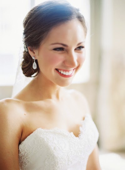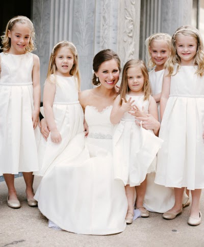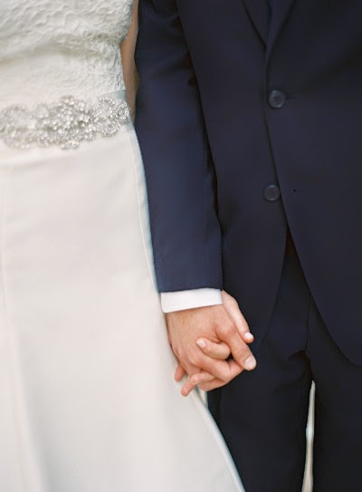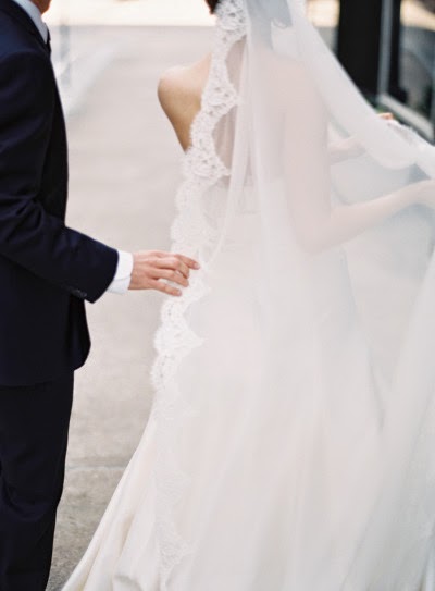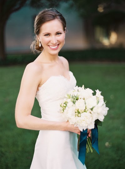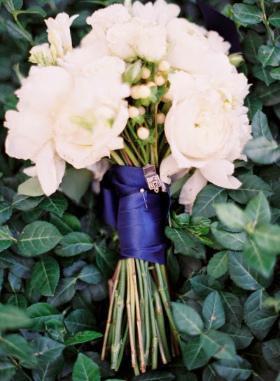 The bride wore a graceful Lazaro gown and a lace-trimmed veil; a crystal belt, sparkling comb, drop earrings and ivory Badgley Mischka peep toes completed her classic bridal look. Kelby's closest friends wore navy dresses of their choosing and nude pumps, and the ladies all carried white bouquets of roses, peonies, freesia, ranunculus, hydrangea and hypericum berries by Birdie. Jeff and his groomsmen naturally wore navy suits-the perfect compliment to the event's chic color palette.