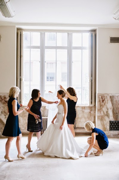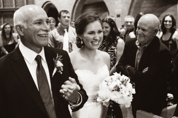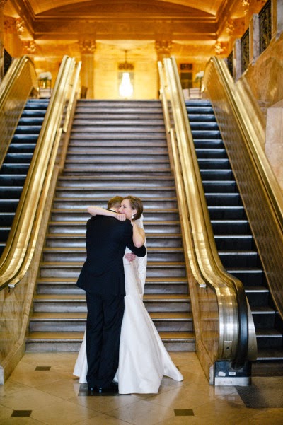 After a sweet first look and a traditional ceremony, the new Mr and Mrs brought their guests to the First National Center for a sophisticated celebration. Leslie Herring teamed up with Innovative Event Solutions, Marianne's Rentals and florist Birdie to transform the building's formal bank foyer into a spectacular ballroom. After a feast provided by Abbey Road Catering and a moving father-daughter dance, guests went twirling across the marble floors before enjoying a slice of Amy Cakes, tied up with a color-coordinated bow. And as Jeff and his bride departed under waving ribbon wands, they knew they'd remember their wedding day for many years to come; thanks to the wonderful work of Brett Heidebrecht Photography, they always will.