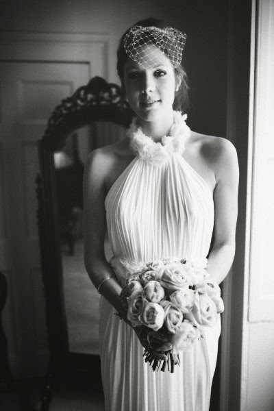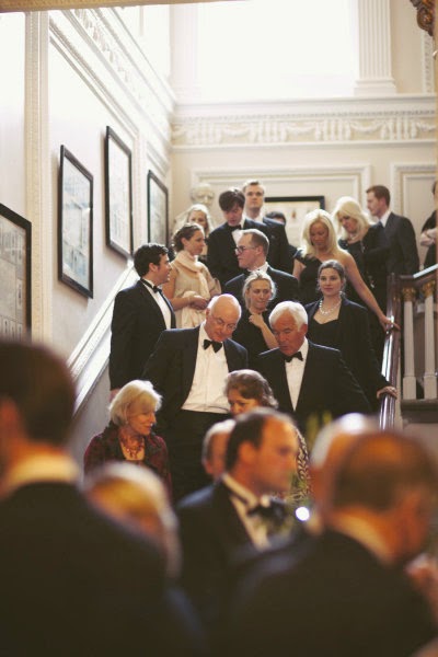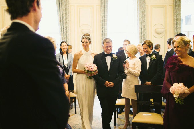 The bride wore a draped silk chiffon gown by David Fielden with rosettes at the neck, the waist and down the back. Blush Dior pumps and a structured white blazer from The Kooples were perfect counterpoints to the romantic gown and Genevieve's 60's-inspired updo, finished with a delicate birdcage veil. The bride carried a bouquet of petal pink peonies and roses by florist Moyses Stevens, while her bridesmaids wore swinging, beaded dresses with a decidedly Gatsby feel and carried ivory rose posies. Matt's striking white rose boutonniere set him apart in a sea of classic black tie.