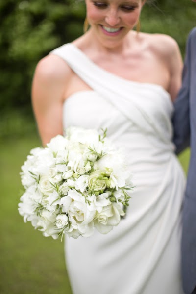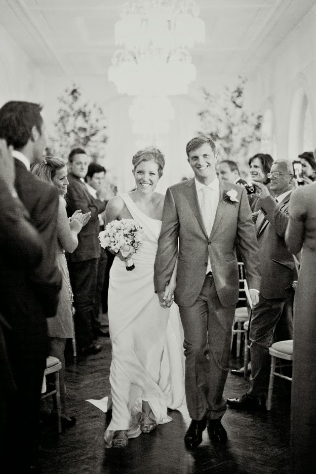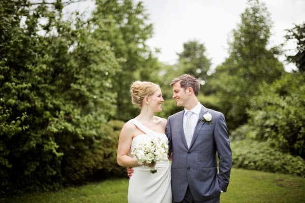 Laura wore Vera Wang's "Evelyn", an ivory silk crepe gown with a single shoulder strap, and a pair of L.K.Bennett slingbacks. Makeup artists Roseanna Velin put up her hair in a simple French twist, and Laura finished her modern bridal look with a pair of dainty Elsa Peretti gold earrings. Hywel chose a grey suit from Canali, a crisp Thomas Pink white shirt and classic Tiffany & Co cufflinks.