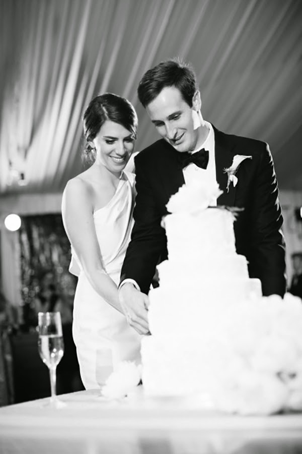 The bride wore a stunning Carolina Herrera gown, and wisely kept the rest of her look simple with a low chignon, drop pearl earrings and a pair of studded Valentino kitten heels. A structured bouquet of white peonies, hydrangeas and calla lilies by Watered Garden Florist was a perfectly appointed final touch. Heather's attendants wore long black gowns of their choosing paired with white and pink peonies posies, while Robert and his groomsmen looked dapper in black tie.