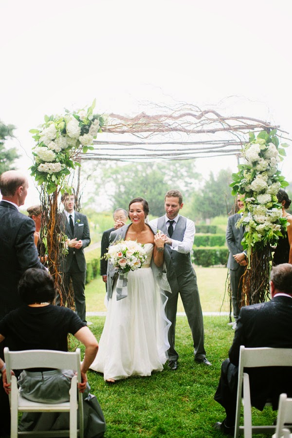 The couple was married in a garden where the bride played as a child, beneath a chuppah decorated with white garden roses and hydrangeas. After a ceremony officiated by family friends which combined the couple's Methodist and Jewish faiths, the newlyweds dashed out of the rain for portraits in the mansion's stunning portico. During the cocktail hour, beer and corndogs were elegantly plated by A Thyme to Cook, and guests sipped the couple's signature cocktail, a mint julep. After a family-style dinner, the whole group gathered on the dance floor to celebrate the new Mr and Mrs in the glow of a perfect summer evening.